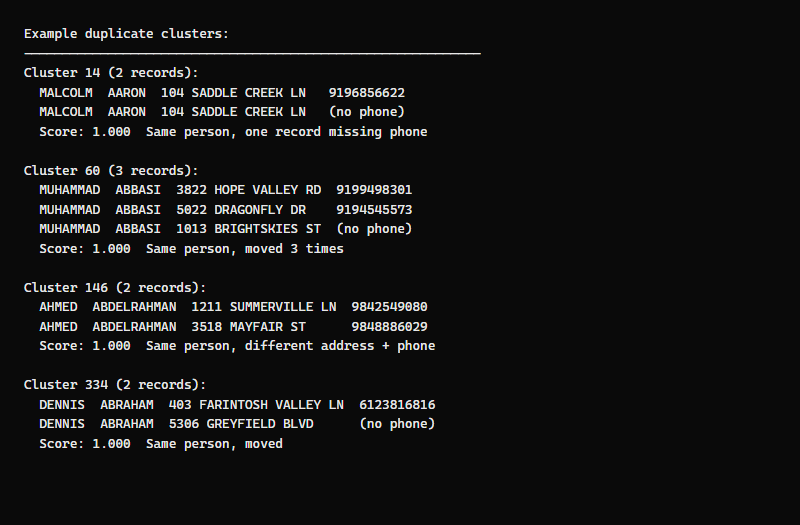 Spot-checking the clusters confirms most are legitimate — same name at different addresses is the dominant pattern, consistent with voters who moved and re-registered. But without labeled data, the true precision is unknown.