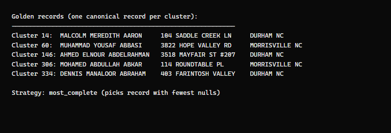 The golden record strategy is most_complete — it picks the record with the fewest null values. For Muhammad Abbasi (3 records, 3 addresses), the golden record uses the most recent address with the most complete data.
