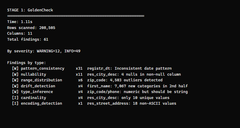 | GoldenCheck | 1.1s | 61 quality findings across 7 check types |