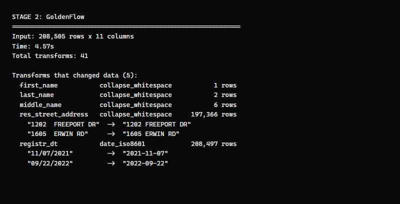 Nearly every address in the voter file has double spaces between the house number and street name — 1202 FREEPORT DR instead of 1202 FREEPORT DR. This is a common artifact of fixed-width data exports. GoldenFlow's collapse_whitespace transform fixes all 197,366 in one pass.