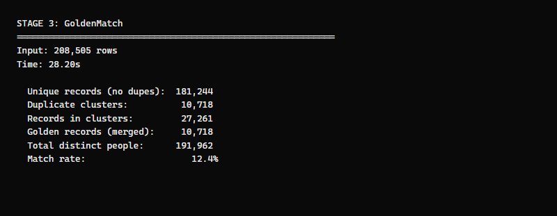 Stage 3: GoldenMatch — Deduplicate (28 seconds)