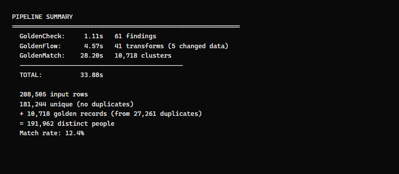 | GoldenFlow | 4.6s | 197K addresses fixed, 208K dates normalized |